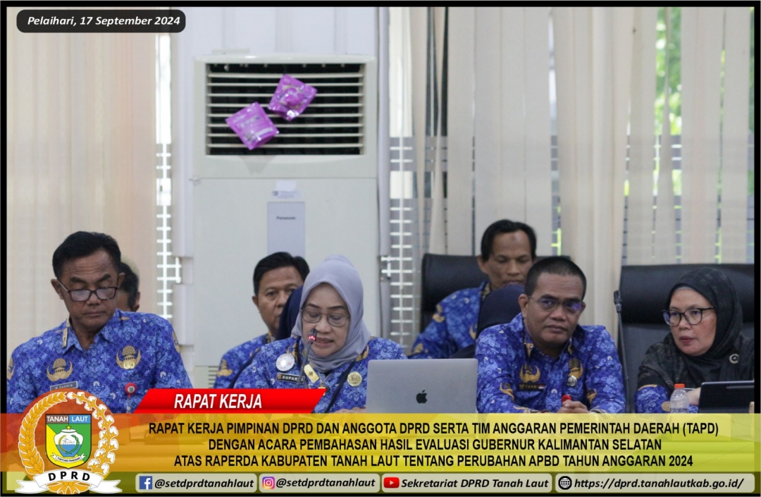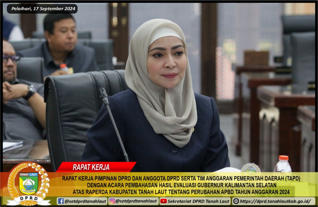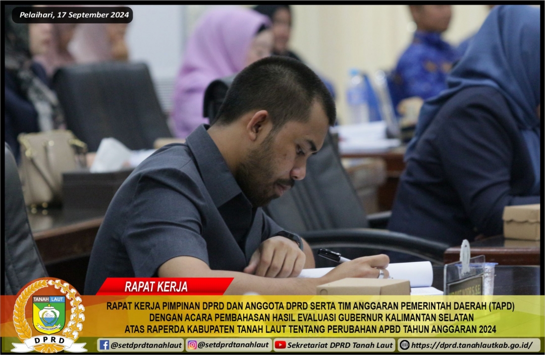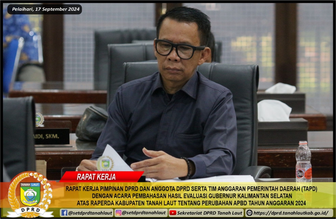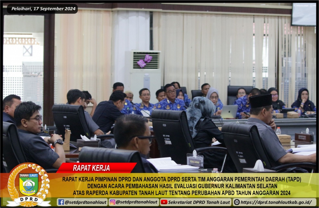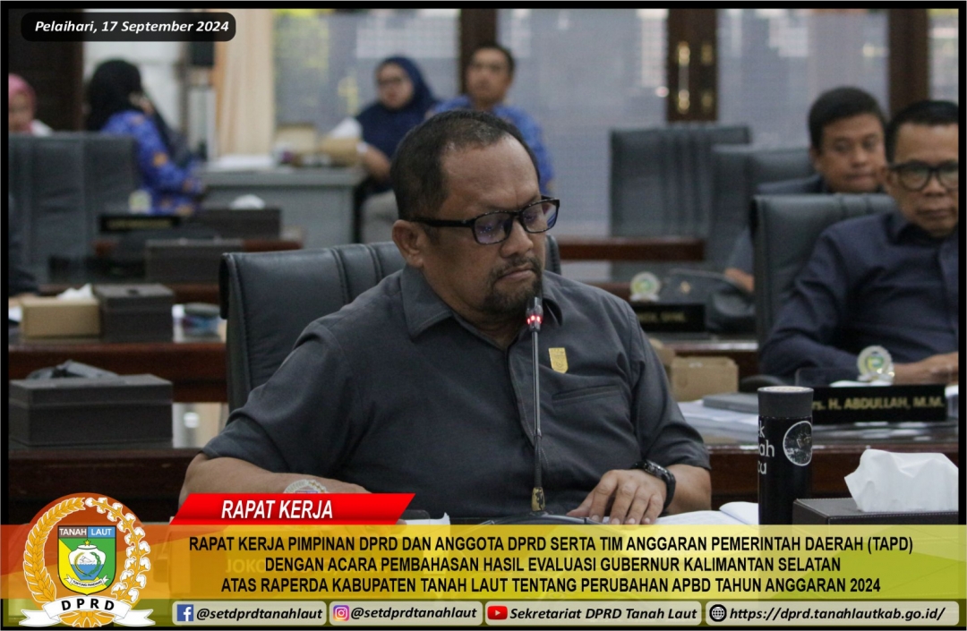 RAPAT KERJA PIMPINAN DPRD DAN ANGGOTA DPRD KABUPATEN TANAH LAUT SERTA TIM ANGGARAN PEMERINTAH DAERAH (TAPD) DENGAN ACARA PEMBAHASAN HASIL EVALUASI GUBERNUR KALIMANTAN SELATAN ATAS RAPERDA KABUPATEN TANAH LAUT TENTANG PERUBAHAN APBD TAHUN ANGGARAN 2024